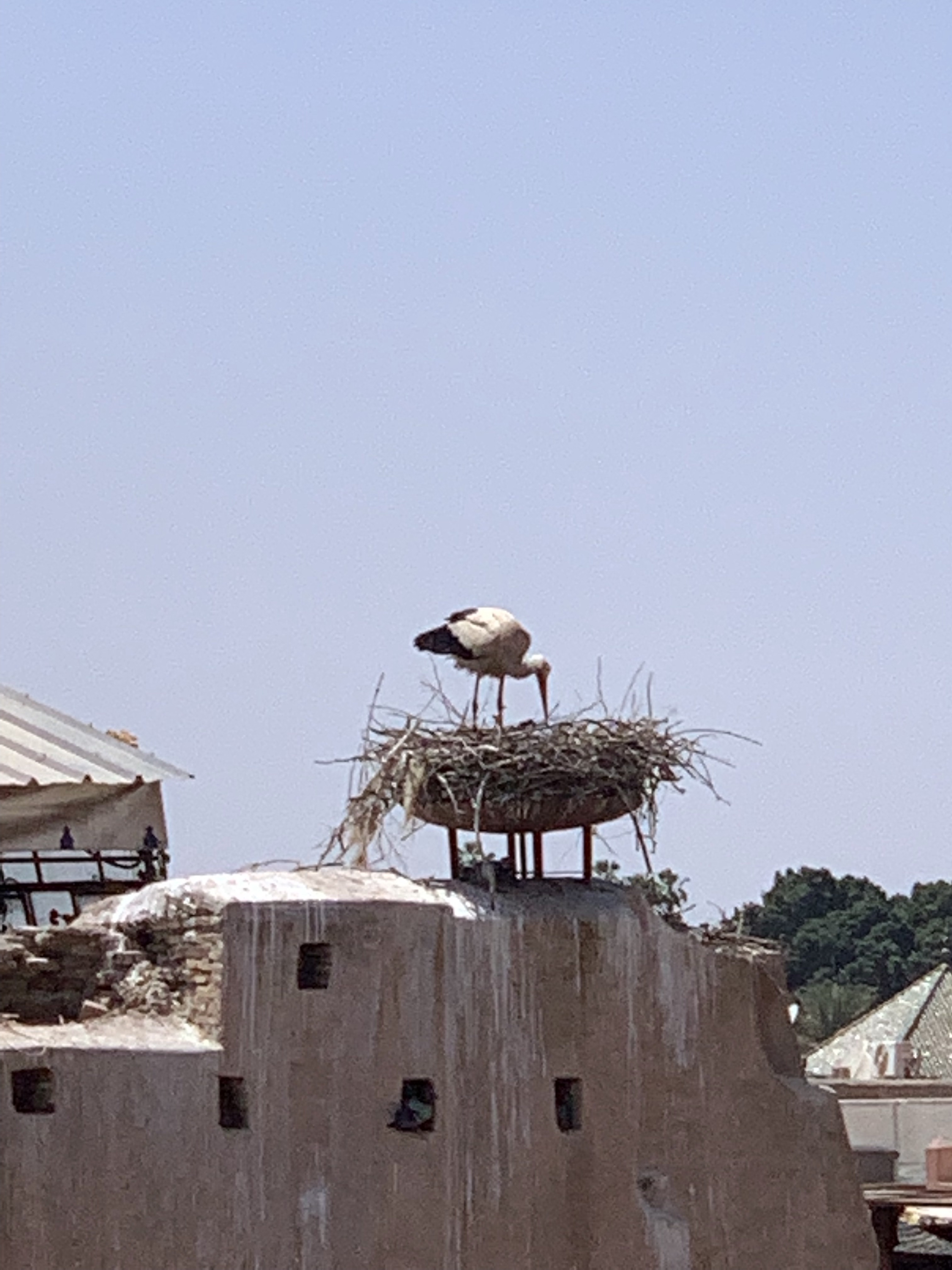 I got another photo of Mama stork Sunday mid-afternoon while I was having a magnificent seafood lunch—my ONLY meal yesterday—a platter full of all the crustaceans of the sea!! A couple with a little boy were seated next to my table at lunch. I took the little boy over to the corner and showed him the stork—a Japanese boy, five years old, who lives in Paris. He came back and excitedly exclaimed to his parents that he saw ‘un grand oiseau’—arms spread wide as he could get them to emphasize just how big the nest was! I was seated in a courtyard when they departed the hotel and he very shyly came over to say ‘au revoir’ to me.